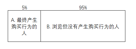 为了更加清晰和避免计算错误,小明绘图做出划分,A表示是最终购买,即转化率是5%的那些人,B就是剩下的,即没有产生购买行为的人。而访问网站浏览这个SKU页面,就存在这两个可能性,一是可能购买,一是可能不购买。将两者之和设定为1,即100%,这被称为标准化条件。这些不同条件划分出不同的可能性。