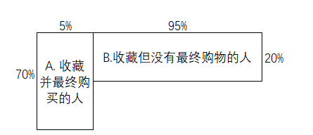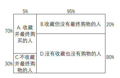 左边的70%和30%的表示收藏与否的最终发生购物行为比例,而右边的20%和80%就是收藏与否都没有发生购物行为的比例。小明很快就可以计算出A,B,C,D四种行为的不同概率: