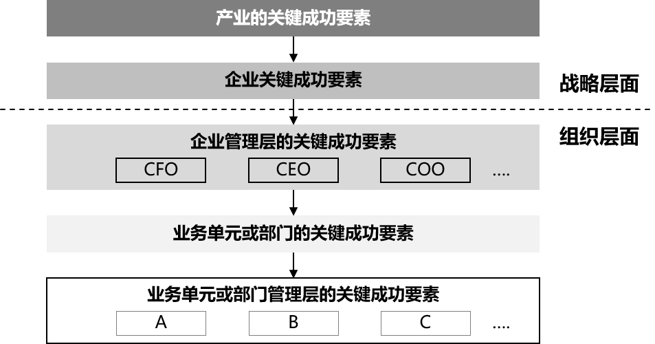关键成功要素要落实到不同的层次,通常分析确立关键成功要素是一个自上而下的过程。如图5-6所示。