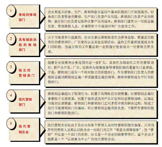 这种组织架构是典型的推销型组织架构,是以生产及内部管理为导向,以控制为原则进行设计的。这种模式在市场经济早期具有一定的科学性和合理性,但随着市场竞争的加剧,这一模式的弊端便暴露出来。