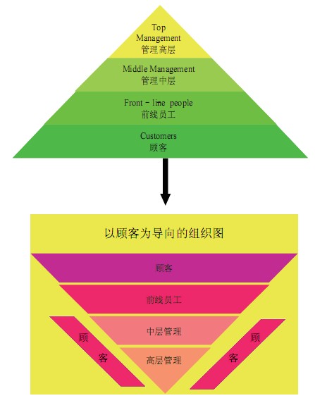 如图8-4所示,以顾客为导向的组织图是倒金字塔形组织,是由传统金字塔形转变而来的,也是目前一种较为受欢迎的组织形式,下面我们就以美菱公司的组织架构的变革为例,来看看这种变革带给企业的可喜变化。