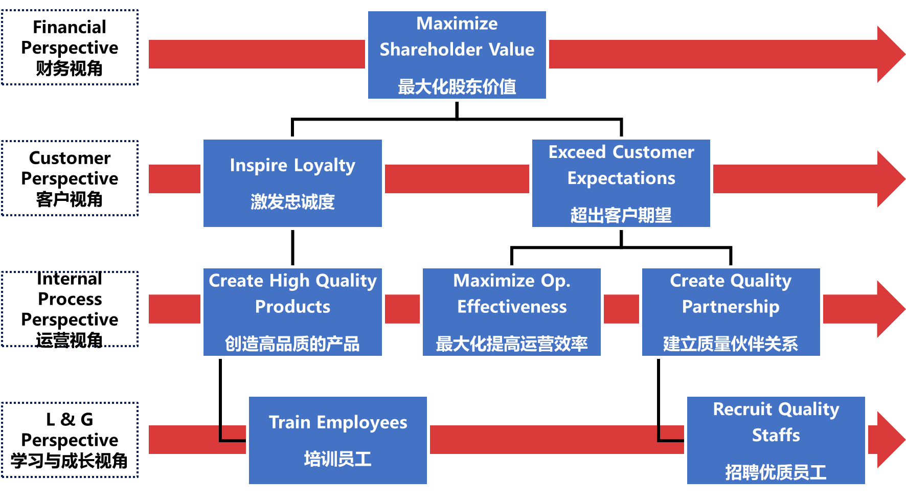 图16-9是用平衡积分卡的工具来制定有意义的战略,每个视角都有一些大目标,每个组织可以根据具体情况再制定下一层的目标和KPI。通过这张图,理解什么是有意义的战略: