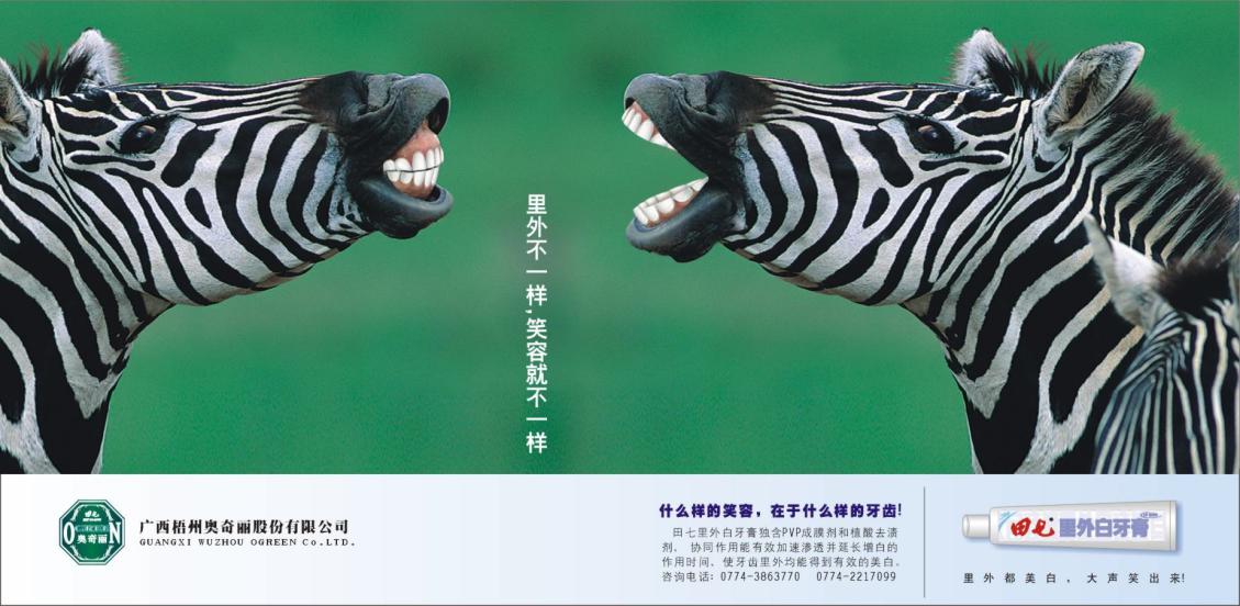 田七里外白牙膏的报纸广告,选了鲨鱼、猩猩、蜥蜴、斑马及人物作为画面主元素,用动物形象做牙膏广告已经让消费者意外,看到她们洁白整齐的牙齿和可爱的笑容,整个画面有了趣味儿,但当动物画面的海报与人物的海报放在一起的时候,配上那一句“里外不一样,笑容就不一样”不免动容,会心一笑,原来也在情理之中,具体如图7-13、图7-14、图7-15和图7-16所示。
