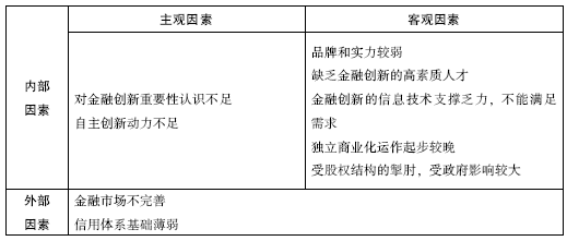 中小银行科技信息开发和建设还相对比较落后,信息化程度较低,不能为客户提供全面的电子信息服务;银行的金融创新与信息技术融合程度低,缺乏深层次数据分析功能的营销系统。这些都是制约中小银行金融创新的重要因素。