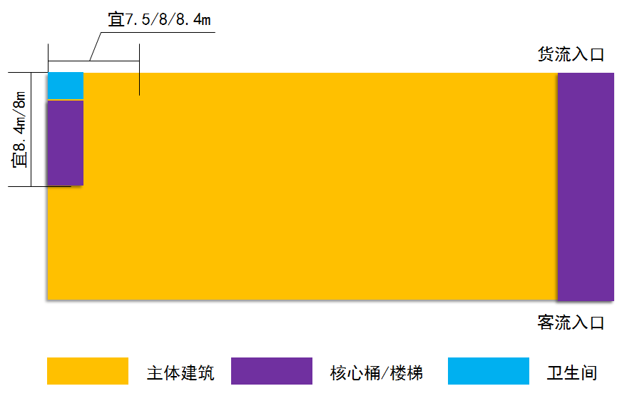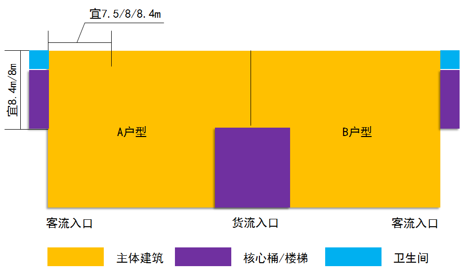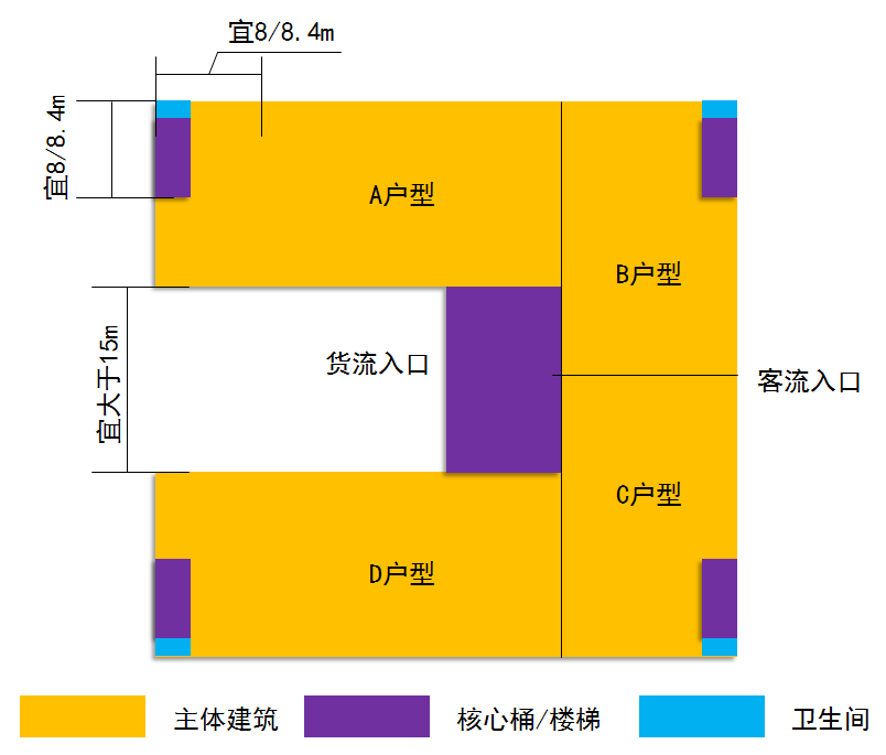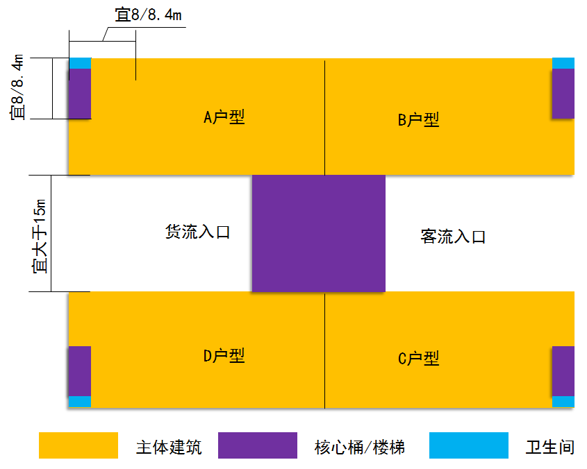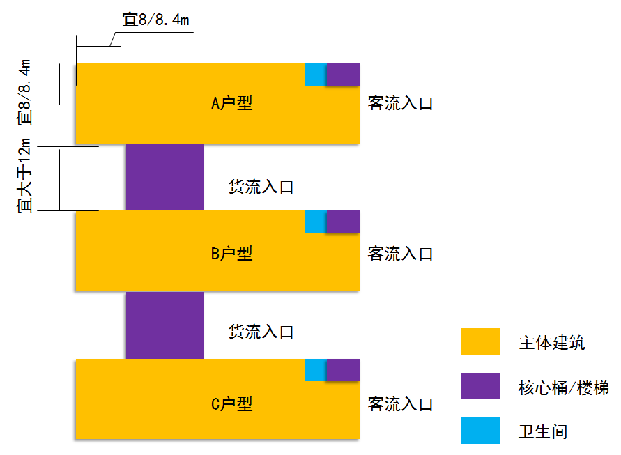 “一”字型厂房适用于独栋、双拼类厂房。宜用7.5米、8米、8.4米柱网,独栋根据面积、层数的要求,可布置成1000~9000平方米单栋厂房,独栋单层不宜低于500平方米,不宜高于1500平方米。
