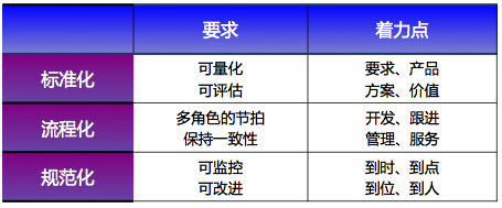 标准化,一定程度上就是量化,大客户营销千头万绪,各凭己意会乱套。多人、多部门、多阶段、多任务的大纵深作业,一套标准化的交流、分析、判断与作业方式,有助于提高大客户营销过程效率。
