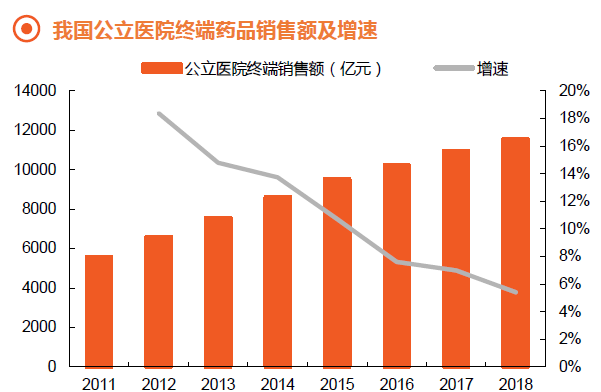 2018年我国药品销售三大终端销售额合计1.71万亿元,同比增长6.3%。目前我国药品销售规模仅次于美国。公立医院终端销售额合计1.15万亿元,占比67.4%,是最大销售终端。三大终端增速均呈下降趋势,公立医院终端下降最快,如图1-4所示,这主要是受到医保控费措施影响。