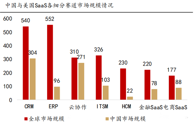 从市场增量预测,中国各SaaS细分赛道市场规模仍有翻倍空间,各细分赛道中,云协作、CRM、电商SaaS领域“实际市场规模”占比较高,HCM、ITSM、ERP领域的成长潜力较大。