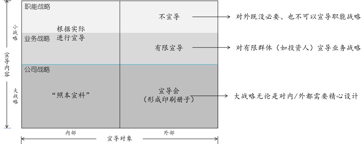 战略宣导重要,那么宣导到什么程度?显然,我们不可以将所有战略内容公之于众,而是应该有所取舍(如图3-20所示)。笔者经常把战略区分为“大战略”和“小战略”“大战略”是公司的发展方向与战略定位,是需要宣贯,也是可以公开的,要对员工、供应商、消费者讲(战略制定之后,不能锁在保险柜里,有些内容需要“广而告之”。有意思的是,在战略宣贯方面,国有企业往往做得比民营企业更好)。“小战略”是竞合战略与商业计划,这块是需要保密的(很多上市公司并购某家企业,内部的人和外部的人一样,也是等公告出来才知道)。笔者经常和首席战略官们交流,不少企业首席战略官认为竞合战略要比商业计划高出两个密级,笔者是同意这个说法的。