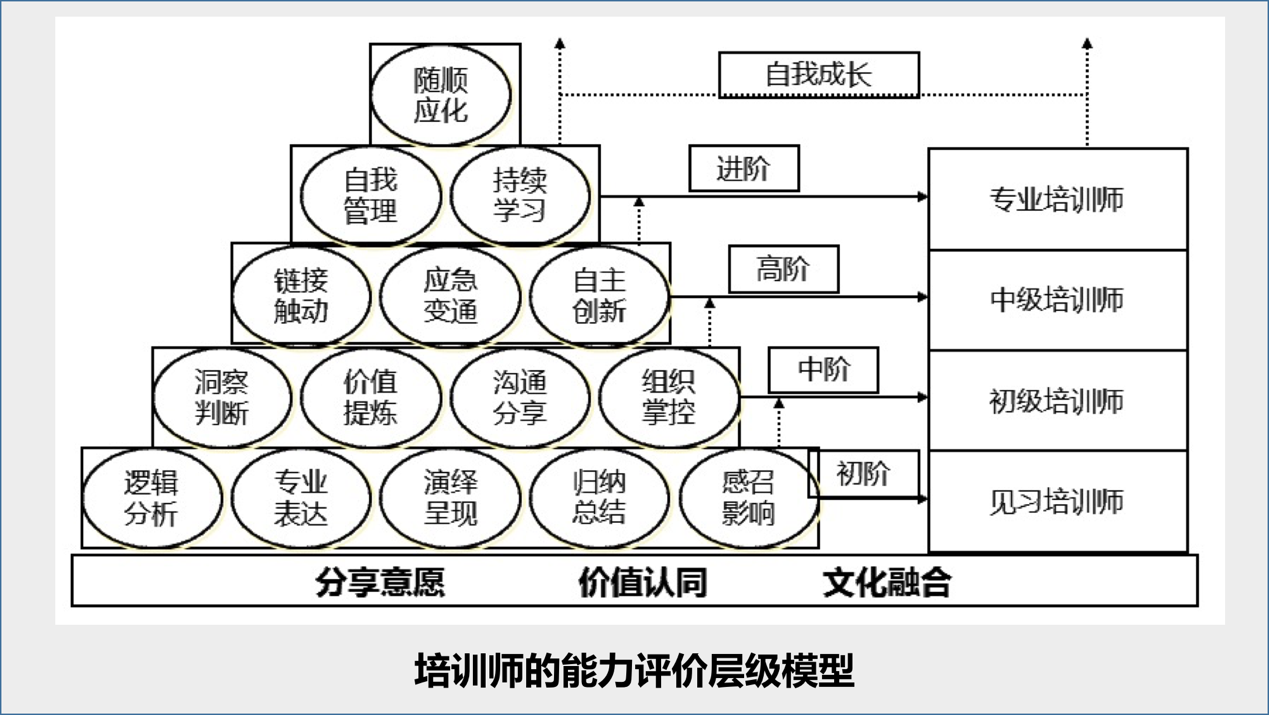 (1)从模型上看,虽然这十五项能力有一定的层级区分,但在具体的职业实践中,这些能力并非梯次提升的关系,与培训师的不同成长阶段并没有直接的因果关系。