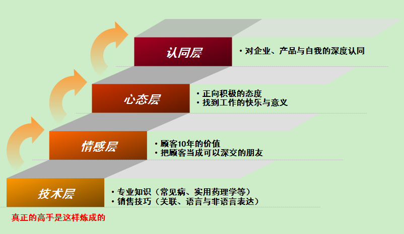 第一层:技术层。不少药店人目前正在努力提高自己的专业技能,其提升的范围就是在这一层。从知识与技能角度来说,这一个层面分专业知识与销售技巧。专业知识包括常见病专业知识、实用药理学知识、中医中药等;销售技巧多以沟通技巧为主,而在沟通技巧中又包括语言表达与非语言表达等。我们目前所做的培训多在这些领域里。