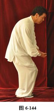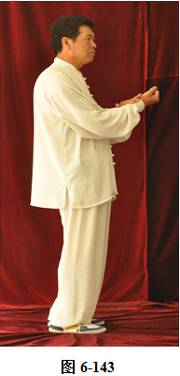 接上式,腰微拱,右手慢慢向右下採,同时右脚落平。左腰随即左外上提,左手顺势左挒,身体转向朝东。右脚随左手掌左挒内转,脚尖朝东。右手内旋翻手心朝上,左腰向右微合,左脚跟随向里转,左手顺势搭于右手腕部。腰下沉,两手随向下打挤。同时左膝放松,左腰微提随之后拱,左脚向左前迈出,脚掌虚着地面。右腰上提走弧线,右掌随之向前划平圆,腰回拱上提,右手随之回收胸前翻转掌心向内。不停顿,左掌随右手前送顺势自然回放左膝外侧,身体随腰走弧线向前移动,重心至左腿,成左弓步,眼神向下远视。腰回拱,重心随之移于右腿,右掌回抽至小腹前。腰微含上提,掌心慢慢翻转向上高过头顶,腰随之向后倚靠,右手随之翻转向右外侧上方,手心朝前。左手心朝向地面, 重心落于右腿上,成后倚之式(见图6-142至6-148)。
