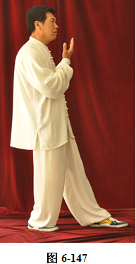 注意:此式要求全身放松,两臂舒展,好似白鹤腾飞之势。收腹含胸,精神要提起,下肢要稳重,左脚虚放地面,眼神注视前方。