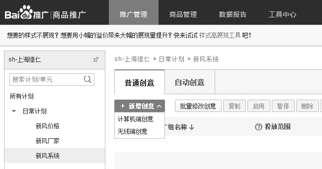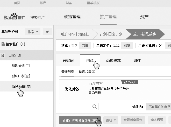 如图3-35,先在百度搜索推广后台左侧树状结构里选择好单元,再点击右侧【创意】,再点下部的【新建计算机设备优化创意】,进入图3-36的界面。