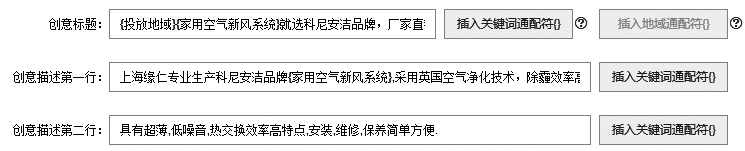 【插入关键词通配符】点击后,在文字框中产生一对大括号{},将本单元里的任意一个关键词填写进去,就能代表匹配单元里所有的关键词(如:新风、新风系统、家用新风系统、商用新风系统等),选哪个关键词是有一定讲究的,建议选择字数比较多的关键词。因为标题只有60个字符,相当于30个汉字,如果选用短词(如:新风),精心把标题写好,30个字全部占满,一旦客户使用的是多字词(如:家用中央空调新风系统),就会把标题尾部的部分广告语挤掉,读起来不完美。所以通配符里的关键词要选用多字词,标题也尽可能不要写满30个字。