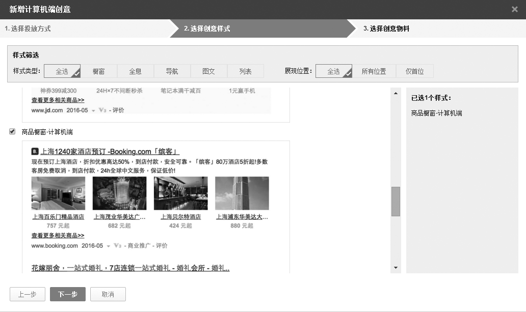 该界面类似于搜索推广管理界面,点击普通创意,新增【计算机端创意】,选择好对应的单元后,进入【选择创意样式】界面,里面有各种样式,找一款适合企业推广的样式,如图3-44所示。我为该企业找了一款【商品橱窗计算机端】样式,进入下一步。