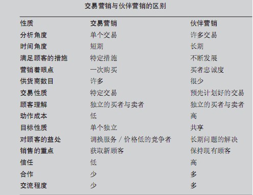 在这些区别中,必须注意,一系列单个的交易不能混同于伙伴营销。交易营销也可以像伙伴营销一样是长期的,比如当一个企业由于A公司每年报价很低而与之签订了五年的合同,除非A公司在第六年有最低的报价,否则在交易营销中它就不可能与之续签合同。那么,在伙伴营销中,现在的供应商将被告知我们很想与你做生意,但你并不是最低的报价者。如果你们能降价 3%,我们就会继续与你合作。