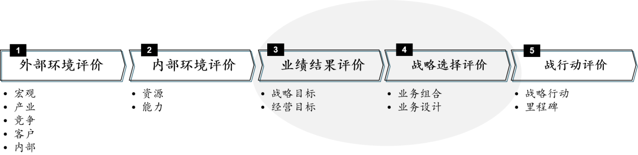 战略评估的流程如图3-52所示,包括外部环境评价、内部环境评价、业绩结果评价等。