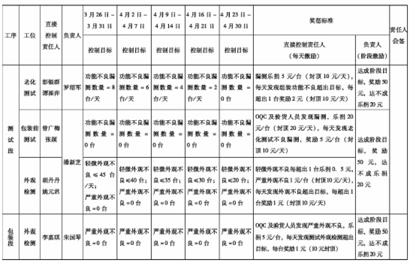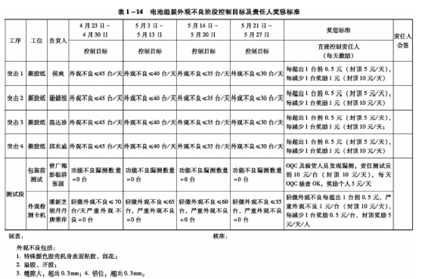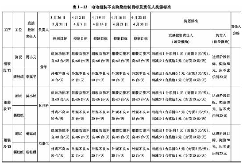 :不能说指标只能往上调,有些指标设得不合理,有时候该高的要高,该低的要低。比如拿不良品的控制为例,修订前的电池组装不良阶段控制目标及责任人奖惩标准如表1-13所示。