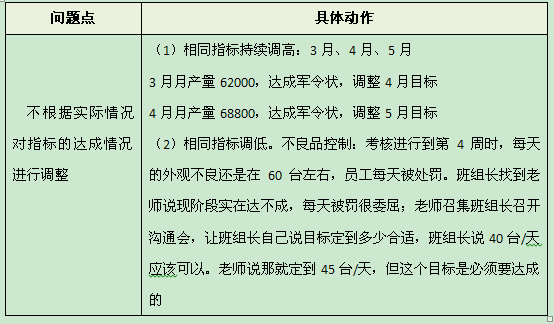 :对。所以基本上员工每天都要挨罚,班组长就找到老师,说现阶段这个目标确实达不成,每天这么挨罚,钱倒还是小事,罚得人都没有工作积极性了。后来老师就召集所有的班组长,再次召开工作会,要班组长说说应该把目标定到多少合适。班组长说定在40台,不要低于40台,说他们再努力一下应该没有问题的。老师说那我们把目标再定得宽松一点儿,把目标定到每天不超过45台,在原来的基础上下降25%。