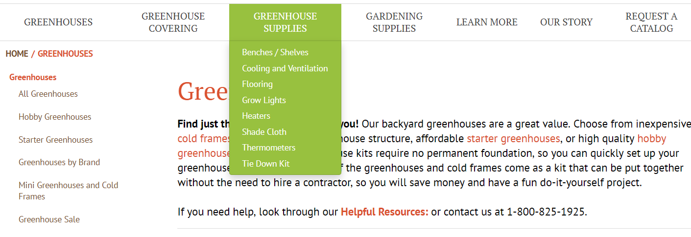 如果单买设备/部件的这一类买家群体还挺多,甚至是重点营销对象,一般就会更倾向于把这些设备/部件独立在“解决方案”栏目之外、并列展示。比如卖整个温室工程定制建造的,一般也会单卖通风设备、除湿设备、淋幕系统等,而且“温室(Greenhouses)”和“温室构件(Greenhouse Supplies)”两个栏目各自展示,比如下面这个国外同行。