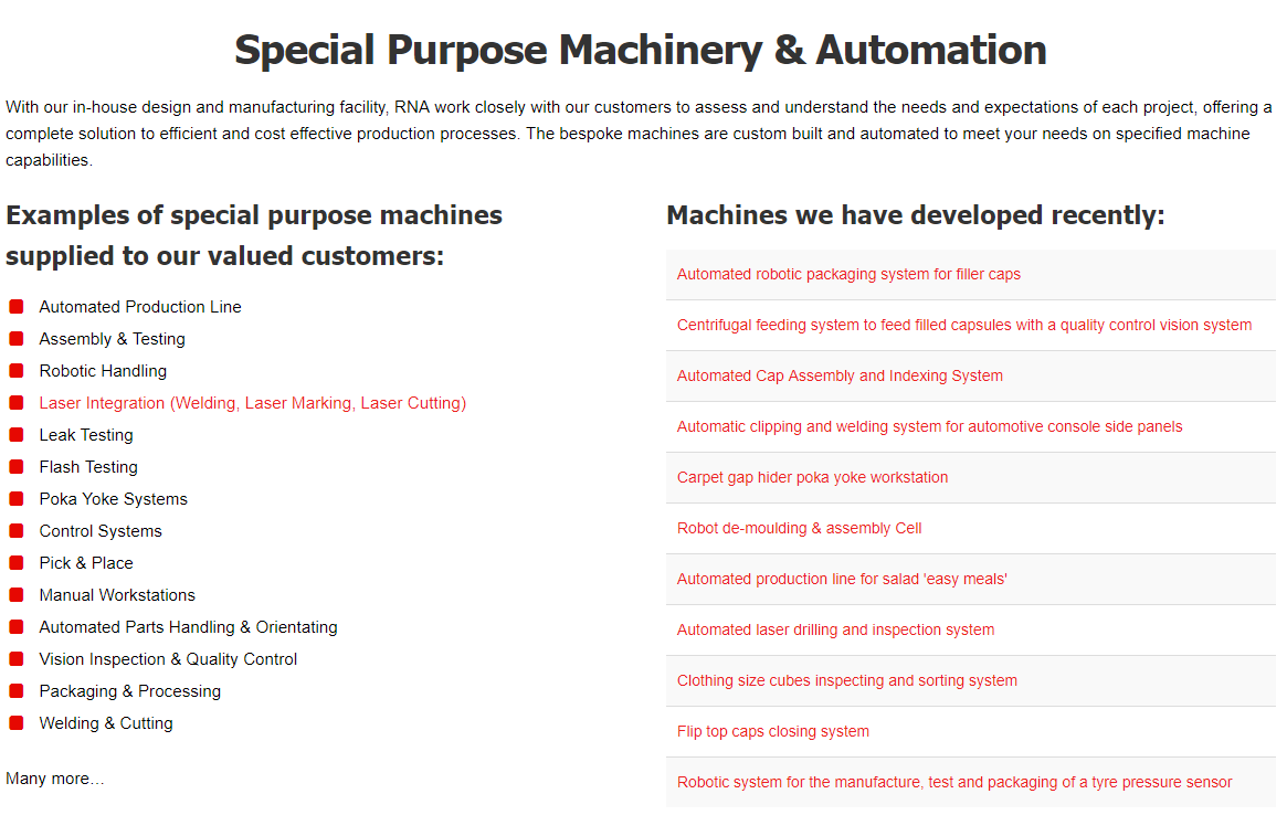 可想而知,这种情况下其实并没有任何现成设备可以做“产品”来直接卖。这家公司在产品目录中展示的,其实只能算是一些他们曾经做过的设备,作为例子展示给潜在买家看,实际合作时都是要重新定制的。这种“定制”虽然看起来自由度非常高,但毕竟并不是什么产品都能做。如果只用“自动装配系统(Automated Assembly System)”或“特殊目的设备(Special Purpose Machine, SPM)”这种大而化之的产品词来做概括,未免不够精准;做过的例子当然更具体,也可以无穷无尽地举,但又未免太过分散。因此,如果我们现在要重新设计这家公司的信息架构,除了上面说的这两方面外,还需要找到一个更加明确的方式来限定和聚焦产品,那就是设备的构成部分。