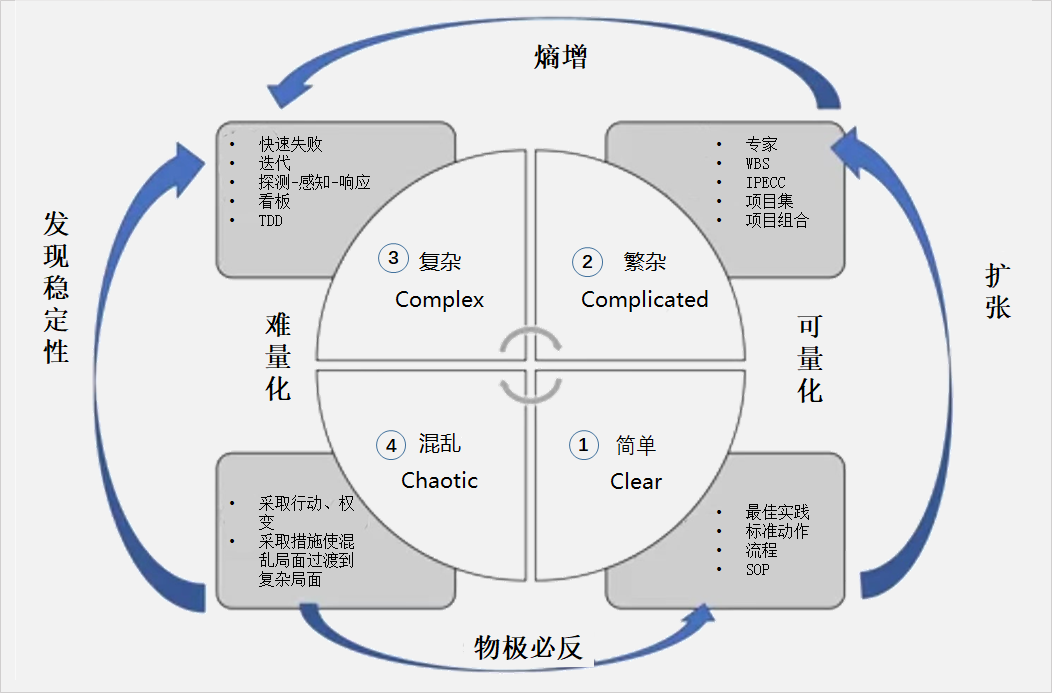 因果关系显而易见,模式重复并保持稳定。方法是感知-分类-响应。管理者可以对事实进行评估和分类,运用最佳实践来作出决策。但要对情况变化保持警惕,避免受限于固有的观念和想法。