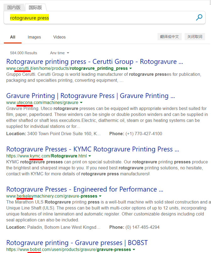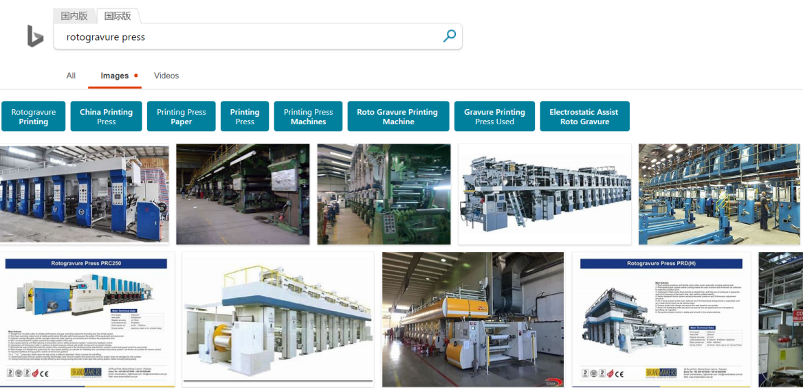 值得一提的是,以目前Google和Bing的智能,搜索结果里会自动推荐大量优质的相关内容,所以有时原本我搜索时输入的那个名称都不完全准确,搜索结果里反而会出现那个真正准确的名称。以凹版印刷机为例,读者有兴趣的话可以用“gravure printing machine”搜索一下,第一页里很可能就会出现类似“rotogravure press”、“rotogravure printing”之类的结果。所以,我们要善于利用搜索引擎的智能,如果看到搜索结果里出现了意思似乎相近的词,可以马上换这个词再搜索核实一次,可能准确性更高。