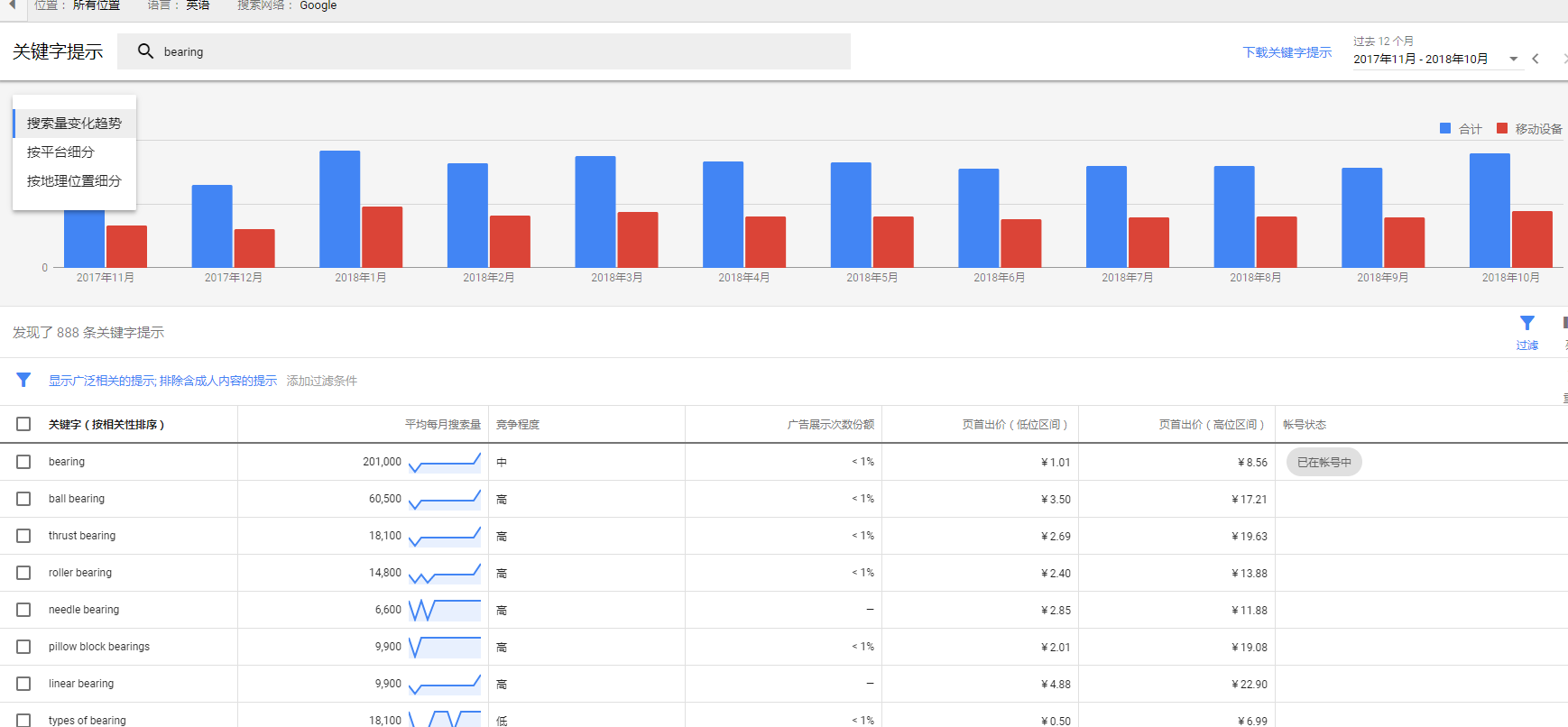这是最常见的方法,而且功能也相对强大,能满足多种需要。输入你已经确定的核心关键词后,关键词工具能迅速为你推荐大量的相关词,而且这些词都是经过数据分析后筛选出来的,一般都具有一定的关注度,潜在价值比较高。针对每个关键词,列表中还会一并显示其日均搜索量和竞争激烈程度,方便进行参考和比较。