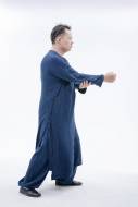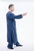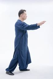 第二个重点,不管是两手相互交叉还是展开再按出,一切小臂的开门关门动作之枢纽都在肘部。以肘部为支点,以根劲为劲源,进行前进后退,开合互换。不要两只手自己动来动去。当后脚踩下去移动重心往前时,两手夹脊吐气而按出,此时脚停手停,手停脚停。一动无有不动,一静无有不静。郑子太极拳三十七式的任何一个动作,都必须符合这个原则。如果说太极基准八法是各派太极的共同准则,那么就郑子太极拳而言,这个“一动无有不动,一静无有不静”就是太极基准第九法。