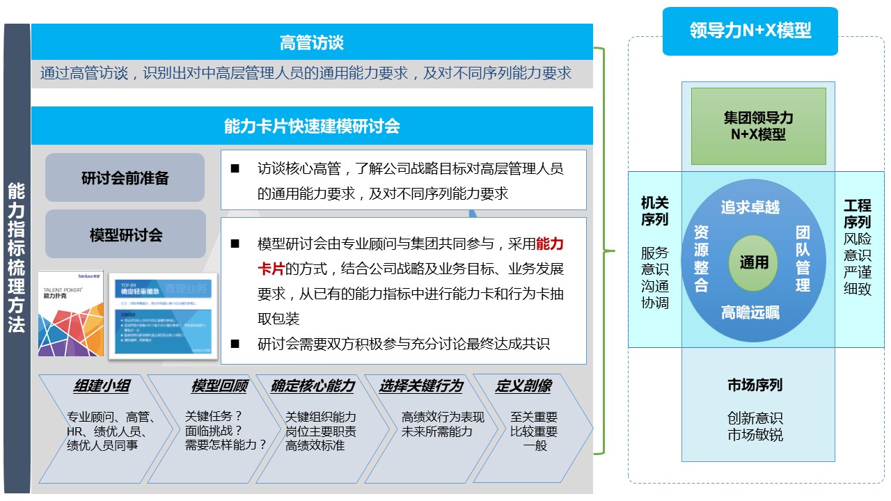 本次项目的盘点对象为中高层管理人员,采取的人才标准形式为N+X能力素质模型,同时兼顾通用领导力要求及专业序列能力要求。在建模方式上,则采取了访谈+建模研讨会双渠道。如图7-15所示。
