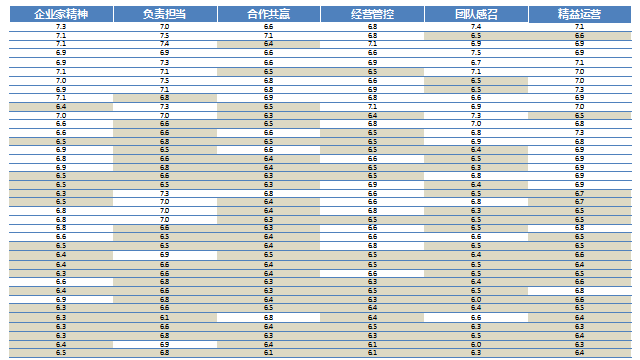 团队特质:利用能力得分矩阵,识别团队整体优劣势、深入了解干部间的能力水平差异及互补情况;分析团队个性特质、领导风格的互补情况。如表7-7所示。