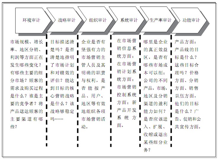 营销审计在国内是一个全新的概念,目前仅在管理非常优秀的少数跨国公司内有类似的机制,它是对一个公司或一个业务单位的营销环境、目标、战略和行动所进行的一种全面的、系统的、独立的和定期的检查。其目的在于确定问题和机会,提出行动计划,以改善公司的营销业绩。