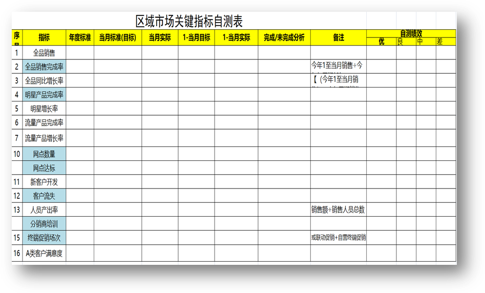过程考核,一般而言是指对重点工作的KPI提炼,比如网点开发、终端建设、产品推广等;什么是过程考核?我们看看肯德基或者麦当劳厕所门背面的“清洁规定”就明白了;那里有一份对照表,清楚规定了清洁的标准与次数;完全量化可执行。