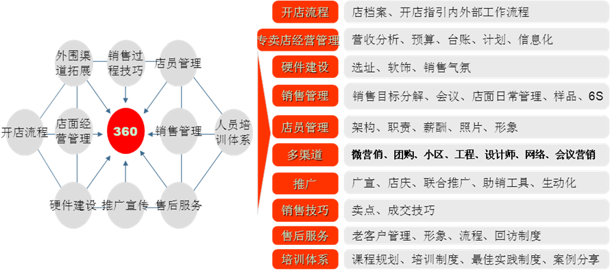 家居建材的门店标准化管理,是一个系统的工程,如上图所示。包含的内容比较多。比如开店流程、经营管理、硬件建设、日常销售管理、店员管理、多渠道管理、日常推广、销售技巧、售后服务、培训体系等。
