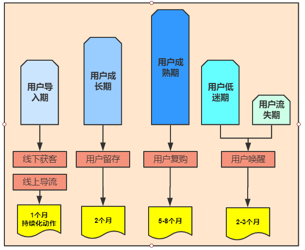 如图1-6所示,用户在平台内的“生平经历”,通常会分为五个大的步骤,“用户导入期” “用户成长期”“用户成熟期”“用户低迷期”“用户流失期”。