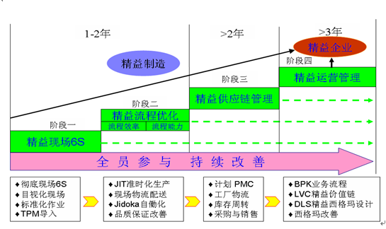 所以,在精益导入之初,企业高层必须充分学习精益的理念和方法,把精益的思想与企业的战略规划结合起来,制订清晰的愿景、使命和阶段性目标。比如我们辅导的一家上市企业,在正式实施精益之前,管理层预先接受了相关培训,并结合公司的愿景,制订了清晰地企业精益愿景、使命和规划。