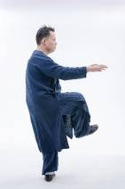 一般来说,这个式子的标准动作是两脚尖要碰触两手,但我通常不这样练。我一向不在意外形是否美观,只关注根劲与炁机导引。这个式子除了身形不好掌握外,要引发炁机运行也不容易。因为一抬腿腹部就容易用力,带脉部分就会因此阻隔而无法进行丹田运转。必须先把刚才说过的基础身形掌握好,然后再把靠山功练出的鼓荡,跟熊经功培育出来的炁机循环一切融入进去,并在脚底涌泉完整接地的情况下,才能让转身摆莲这个式子发挥最大的效用。