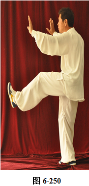 接上式,腰微含,左腿屈膝下垂,左脚向后落步;腰微含,向左转,身体随之左后转,重心落于左腿。右脚尖随身体左转向里转, 腰微拱,重心随之落于右腿,左脚跟随右脚内转向里转。腰下沉, 两腿屈膝,两臂随腰下沉由掌变松拳,拳心朝上。跟着向下划立圆于腹前;腰上提,重心落于右腿。提左膝,腰微含向前蹬出,脚掌心朝外。两臂随腰上提,由松拳变掌向上搂至胸前,随腰微含向前蹬脚时,两臂向左右开,掌心翻转朝外,眼神注视前方(见图6-247至6-250)。