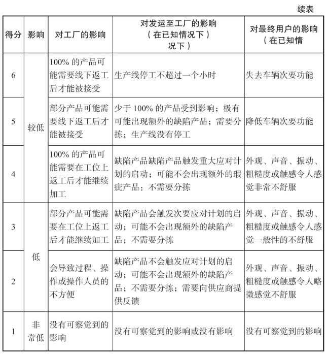 判定准则:后果的严重度级别指当一个潜在失效模式造成了在最终顾客和/或制造/组装工厂的缺陷,应该随时首先考虑到最终顾客。如果在两者都发生缺陷,则采用较高一级的严重度。如表7-1所示。