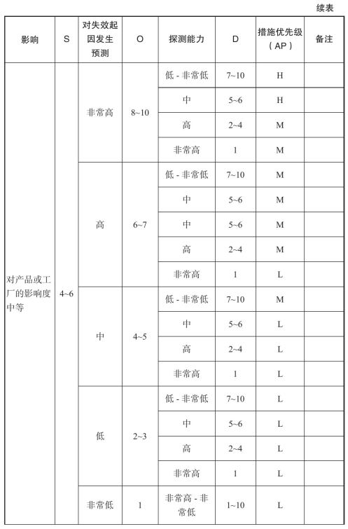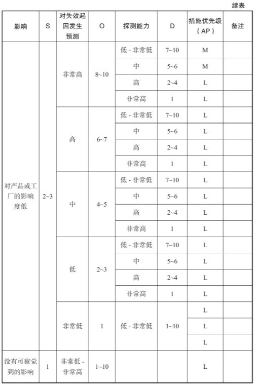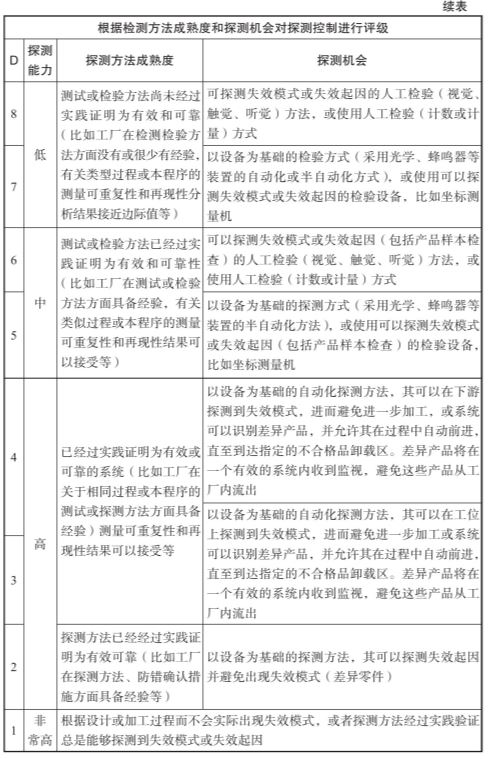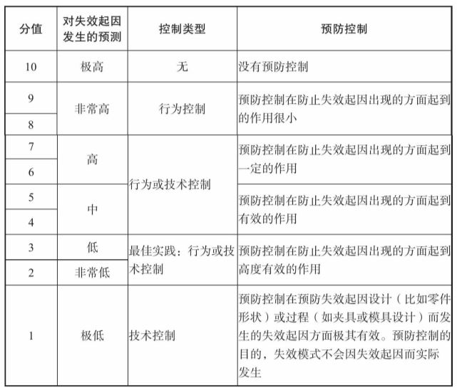 预防控制的有效性:在确定预防控制的有效性时,应考虑预防控制是否为技术措施(依靠机械设备、工具寿命、工具材料等),或应用最佳实践【夹具、工装设计、校准程序、防错确认、定期检修、工作说明、统计流程控制表、过程监控、产品设计等,或行为措施(依靠持有证书或未持有证书的操作人员、技术工人、团队领导等)】。