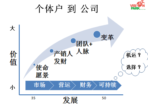 企业主这阶段的任务是要赶快投资时间和资金,“学习”如何使自己从“个体户”的经营模式转变成真正的“企业化”经营模式,以便实现企业的“可持续性”,进而创造企业的估值,为将来退休时可以“兑现”做准备。