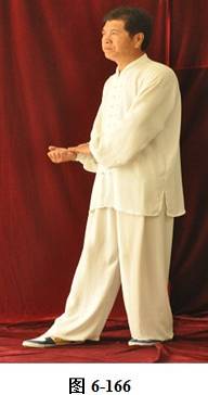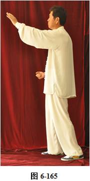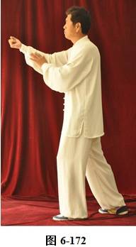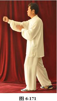 接上式,腰微含,向右外转,重心随腰转落于右腿,两手由捋式变右搬捶,右掌变松拳,左手仍搭在右拳腕部,与右膝成三角。左腰微上提,左脚提起,向前上一步;松腰微拱,向右外平转,上提向左旋转,身体随之缓慢左转。随转体右拳自右肋旁而上向胸前方搬出,随搬随着臂外旋,使拳心慢慢翻转朝上,随即渐渐向左下弧形抽回,左掌也同时随转体弧形向右经右臂里侧前拦,掌心朝右, 眼神观注左掌。腰后拱,重心移于右腿,右拳弧形收回胸前,左掌护住右拳,左掌在前,右拳在左肘里侧(见图6-165至6-173)。腰微含,右膝微屈,身体后倚,右臂拳随身体后倚,略收胸前。腰右外旋转,随转左脚往右里侧内扣,脚尖朝向西北。左臂回拉,向里翻转掌心朝下,重心移落左腿。腰微含,右拳随重心转移左腿变掌, 成左抱球状。